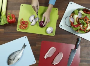 Una de las formas que se puede aplicar para evitar la contaminación es usar tablas de picar diferentes, una para carnes en general (pollo, carne de res, mariscos, pescados, etc.) y otra para cortar o pelar frutas y verduras.